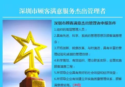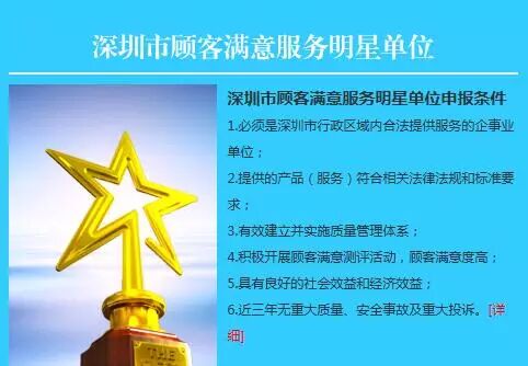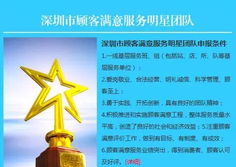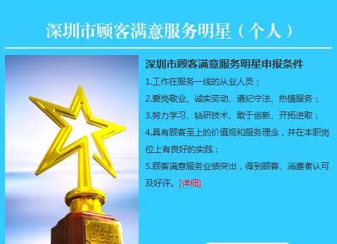 深圳市争创“顾客满意服务明星”活动,已经开展了七届,由深圳市质量协会、深圳市总工会、深圳市妇女联合会、共青团深圳市委员会等联合主办的“第八届深圳市顾客满意服务明星”评选活动已经启动,活动将以服务行业的从业人员、基层团队(班组)及服务性单位为主要参评对象,采用顾客评价、现场访问、专家评审等程序,产生2016年深圳市顾客满意服务明星及推荐全国“用户满意服务之星”。