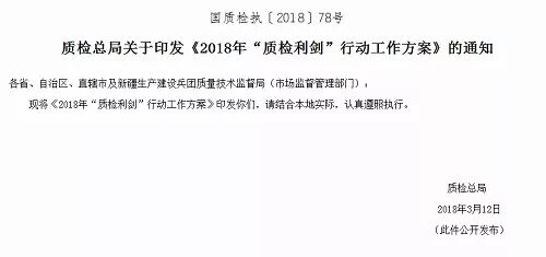 从质检总局获悉,2018年“质检利剑”行动工作方案已于近日印发。