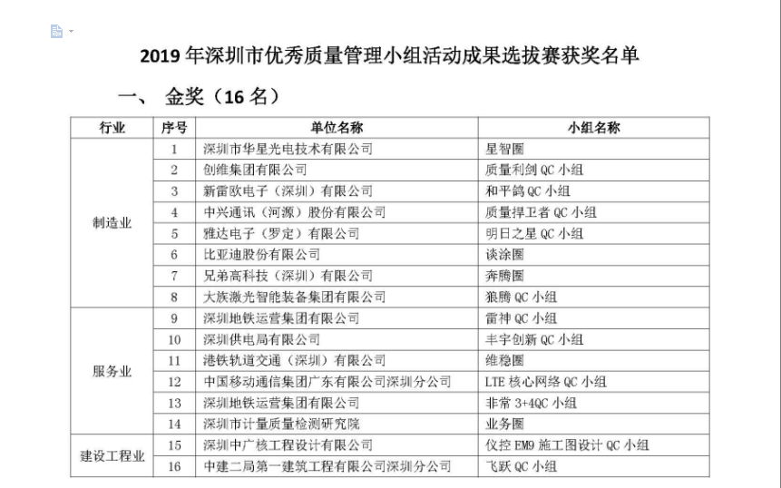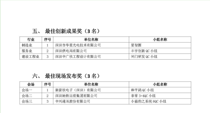 经企业内部选拔、成果申报、成果材料评审、现场发表赛四个程序,最终,“深圳市华星光电技术有限公司星智圈”等16个QC小组获得金奖,“中兴通讯股份有限公司亮剑出击QC小组” 等33个QC小组获得银奖,“海能达通信股份有限公司老中医圈”等30个QC小组获得铜奖,“昊阳天宇科技(深圳)有限公司突飞猛进圈”等74个QC小组获得优秀奖。
