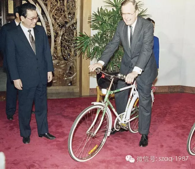 1989年,天津生产的飞鸽牌自行车十分闪亮地登上世界的舞台。当年,时任国务院总理李鹏将两辆飞鸽自行车送给老布什夫妇,这个场面被全世界上百家新闻媒体进行了报道。不久,法国一客商一下子订了3万辆飞鸽车。诞生于60年代的飞鸽,被注入了新的活力。图为1989年,美联社记者拍摄的“老布什骑车”。
