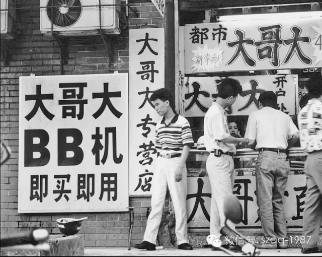 上世纪90年代,“大哥大”进入了中国人的生活。在通讯困难的年代,拥有“大哥大”是一种财富和身份的象征,腰胯BP机,手拿“大哥大”曾是人们羡慕的行头。图为90年代,深圳街头的景象。