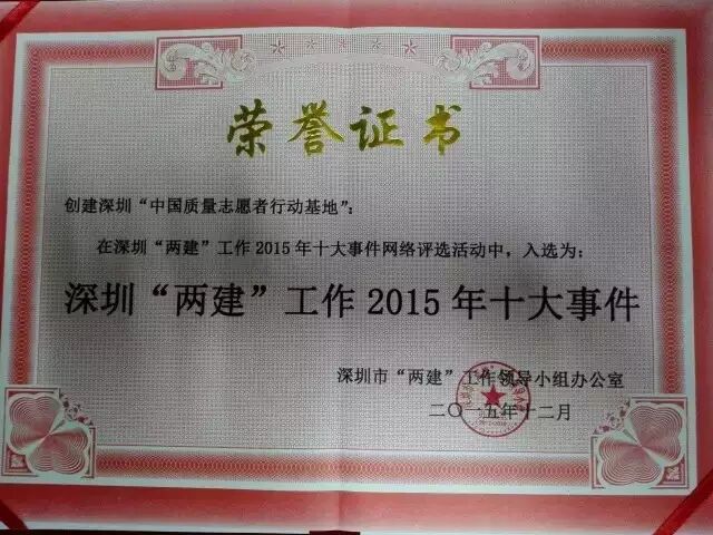 12月21日,“中国质量志愿者深圳总队”以32992票成功入选2015年深圳市“两建”十大事件。深圳市副市长、市“两建”工作领导小组组长陈彪和市市场和质量监管委副主任、市食品药品监管局局长岳新为深圳市政协常委、市质量协会执行会长李榕等10家入选单位代表颁发证书和牌匾。 “质量志愿者”之名开始广为人知,迅速在深圳各行各业传播开来。截止2016年1月6日,志愿者人数达到61人,涵盖了深圳制造业、服务业、建筑业等领域的质量精英和专家学者。