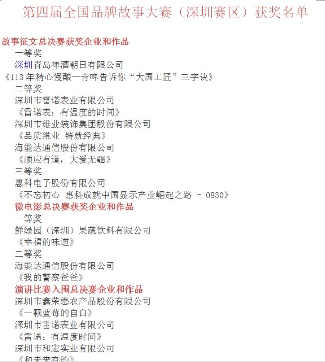 经过17个分赛区比赛角逐,各赛区脱颖而出的优秀作品进入全国总决赛。其中,深圳赛区共有10家知名企业闯入总决赛:深圳市鑫荣懋农产品股份有限公司、深圳市雷诺表业有限公司、深圳市和宏实业有限公司三家企业将进入演讲比赛总决赛,与来自全国各地其他优秀企业同台竞赛;故事征文和微电影直接由评委组评选出各名次。经过激烈的角逐,深圳青岛啤酒朝日有限公司获得故事征文一等奖,深圳市雷诺表业有限公司、深圳市维业装饰集团股份有限公司、海能达通信股份有限公司获得故事征文二等奖,惠科电子股份有限公司获得故事征文三等奖;在微电影比赛环节,鲜绿园(深圳)果蔬饮料有限公司荣获一等奖,海能达通信股份有限公司荣获二等奖。