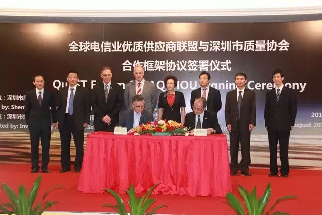2014年8月28日,全球电信业优质供应商联盟首席执行官Fraser Pajak和深圳市政协常委、市质量协会会长李榕分别代表双方签署框架合作协议。华为、中兴、市质协等企业和机构成为首批核心创会成员,市投资推广署等职能部门开通绿色通道,在政策上和技术上给予支持和推动。QuEST Forum深圳分论坛筹建引起深圳市政府高度关注,许勤市长亲自批示确保项目成熟落地,深圳市副市长吴以环会见QuEST Forum论坛首席执行官Fraser Pajak,并送上一份精装版的《孙子兵法》;